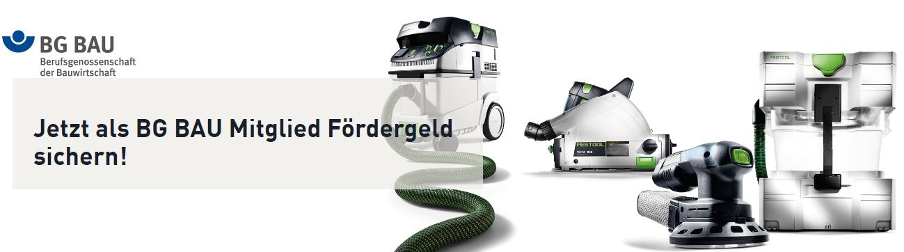 Beim Kauf einer Festool Handmaschine in Kombination mit einer Absaugeinheit sowie einem Bau-Entstauber mit Zulassung zur Staubklasse M erhalten Sie von der BG BAU eine Förderung der Anschaffungskosten in folgendem Rahmen: