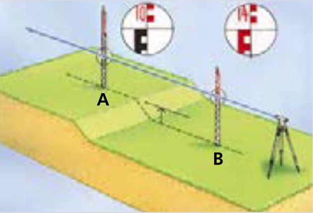 Um den Höhenunterschied in diesem Beispiel zu messen, wird die Nivellierlatte zuerst an Bodenpunkt A aufgestellt. Die Nivellieroptik hat sich automatisch horizontal ausgerichtet – durch das op-tische Zielkreuz liest man ab, in welchem Abstand Punkt A von der blau dargestellten Visierlinie ist. Jetzt wird die Latte an einen beliebigen Punkt B gesetzt und durch die Zieloptik der zweite Messpunkt abgelesen.